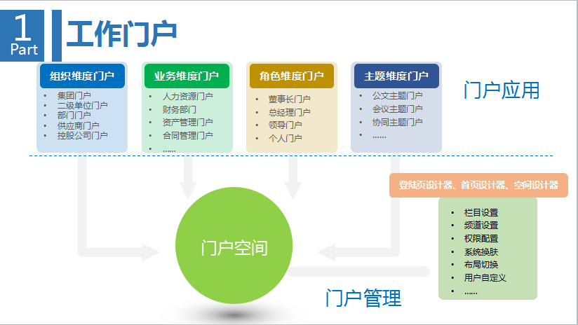 第一環(huán),也是最基本的,企業(yè)內(nèi)部的工作協(xié)作。實現(xiàn)組織維度門戶、業(yè)務維度門戶的建立,二元化工作流,知識的沉淀與分享,企業(yè)文化建設(shè)。