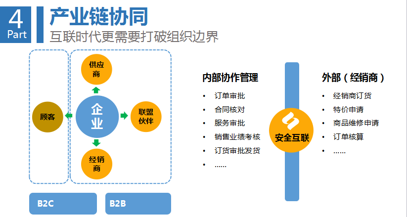第四環(huán)是產(chǎn)業(yè)鏈協(xié)同。企業(yè)要在生態(tài)中間完成協(xié)作,比如說供應鏈、訂單、交易、分享的協(xié)作,企業(yè)的生態(tài)和上下游之間要完成相互協(xié)作。